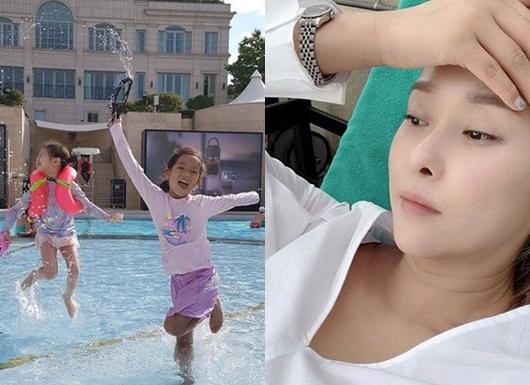 공개된 사진에는 야외 수영장에서 물놀이를 즐기고 있는 현영의 딸 다은 양과 현영의 모습이 담겨 있다.