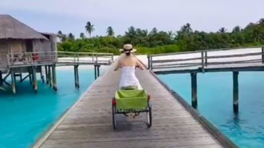 공개된 영상을 보면 이정현이 몰디브의 한 리조트에서 자전거를 타고 있다.