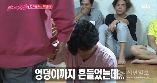 최성국은 "오랜만에 어필 해보겠다"며 기둥을 붙잡고 엉덩이로 강경헌의 이름을 쓰기 시작했다.