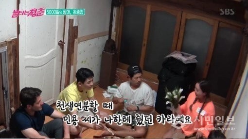 이날 녹화를 마치고 야식을 즐기던 멤버들 사이에 이의정이 등장했다. 이의정은 뒤에 뭔가를 숨기고 있었다. 그러더니 카라꽃을 최민용에게 줬다.