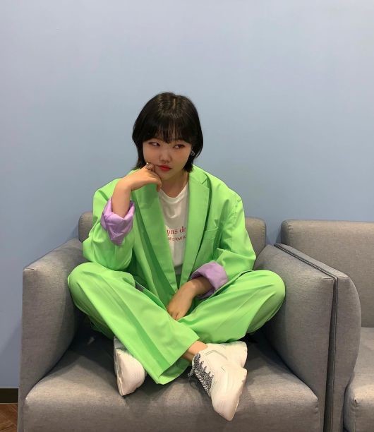 사진 속 이수현은 형광초록색 정장에 흰 운동화를 신고 쇼파에 앉아 턱을 괴고 있는 모습이었다. 다른 사진에서는 일어나 공룡 흉내를 내고 있었다.