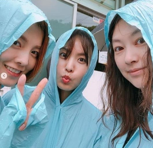 공개된 사진 속에는 김성은이 방송인 박지윤, 배우 신애와 함께 우비를 입은 채 카메라를 바라보고 있다. 세 사람은 화장기가 없는 얼굴에도 뛰어난 미모를 자랑하고 있어 눈길을 끈다.