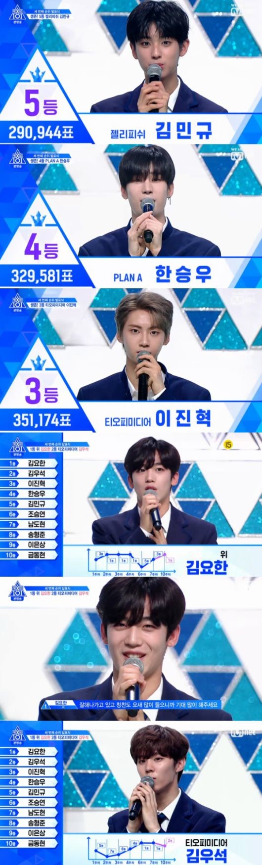 1주차 67등으로 시작한 위에화 조승연은 28만 1580표를 받아 6등이 됐다. 5등은 29만 944표 젤리피쉬 김민규였다. 연습생들이 선택한 PICK으로 황윤성이 뽑힌 가운데 최종 순위 1등~4등 후보 연습생이 공개됐다.