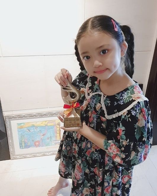 공개된 사진 속에는 서우가 미술대회에서 받은 상을 들고 있다. 카메라를 향해 미소짓고 있는 서우는 사랑스러움 그 자체다.
