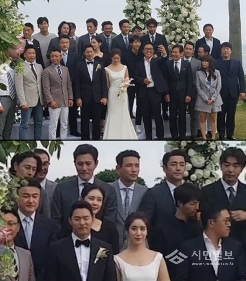 장동건은 민혜연 주진모 부부의 동료들이 함께 하는 기념촬영 중 몰래 손으로 주진모의 등을 밀려 장난기를 드러낸 것.