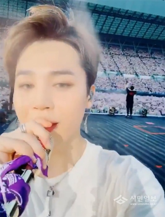 공개된 영상 속에는 지민이 무대에서 노래를 부르는 모습이 담겨있다. 특히, 카메라를 이리저리 돌리며 팬들을 담아내는 모습이 인상적이다.