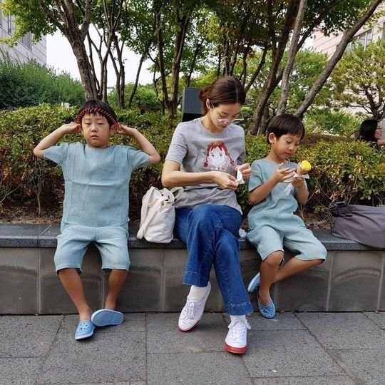 사진 속에는 서언-서준 형제와 공원에서 여유를 즐기는 문정원의 모습이 담겼다. 똑같이 하늘색 옷을 입은 서언-서준 형제의 앙증맞은 자태가 시선을 사로잡는다. 문정원의 소멸할 듯 작은 얼굴 크기도 돋보인다.