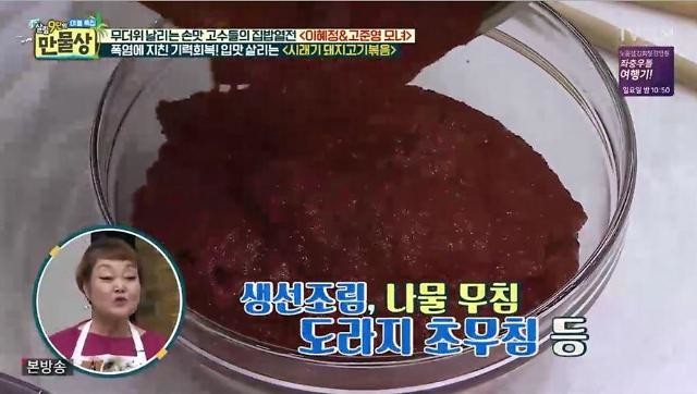 이혜정 요리연구가는 만능 고추장 양념장 레시피를 소개하며 “볶음, 조림, 무침은 물론 김치 담을 때도 활용할 수 있다”며 “고추장과 고춧가루의 비율과 파인애플 통조림을 넣는 것이 중요하다”고 말했다.