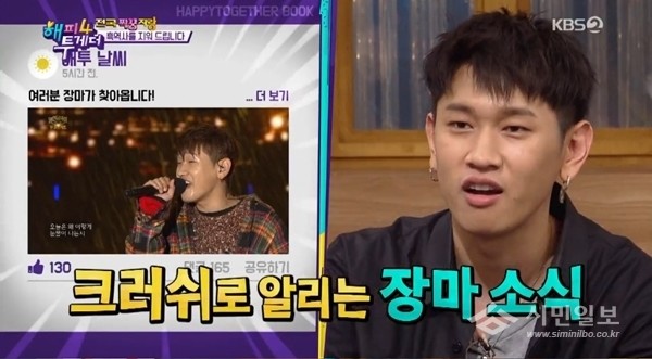 이날 방송에서 크러쉬는 가요계 4대 폭우에 등극했다고 밝혔다. 그는 "에프엑스, 포미닛, 하이라이트에 이어 비를 맞고 무대에 섰다"고 말했다.