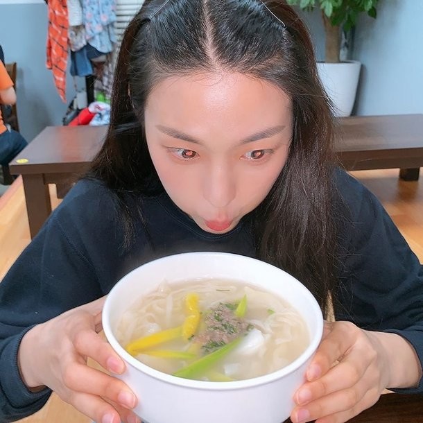 공개된 사진 속 설현은 식당에서 칼국수를 먹고 있는 모습이다. 입술을 쭉 내밀고 있는 설현의 깜찍한 표정이 눈길을 끈다.