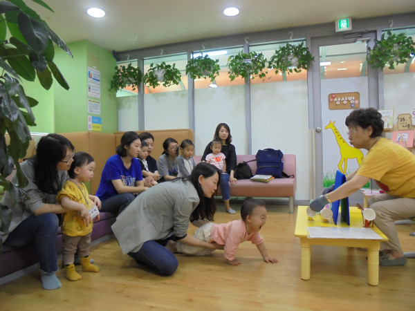 | ▲ 길꽃 어린이 도서관에서 아기와 엄마가 '아장아장책놀이 프로그램'에 참여하고 있다. (사진제공=강서구청) | ||