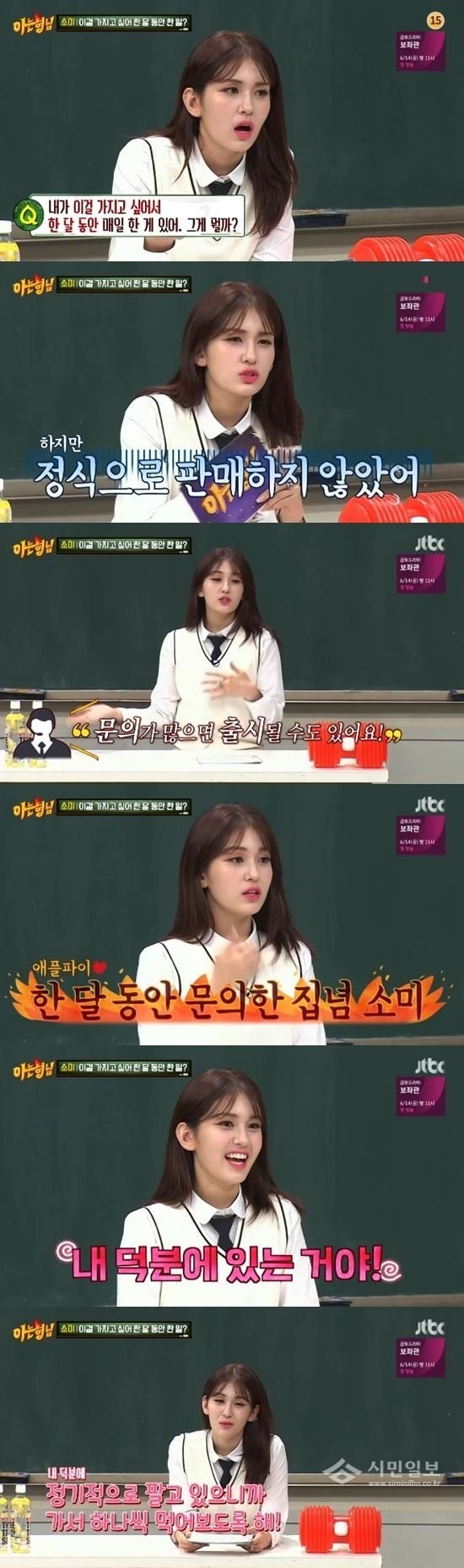 그는 "문의가 많으면 출시될 수 있다고 하더라"며 전소미처럼 애플파이 출시 문의가 들어온다고 밝혔다. 계속된 문의가 있으면 출시가 될 수도 있다는 말에 전소미는 매일 고객센터에 연락해 애플파이 출시를 요청하게 됐다고 고백했다.