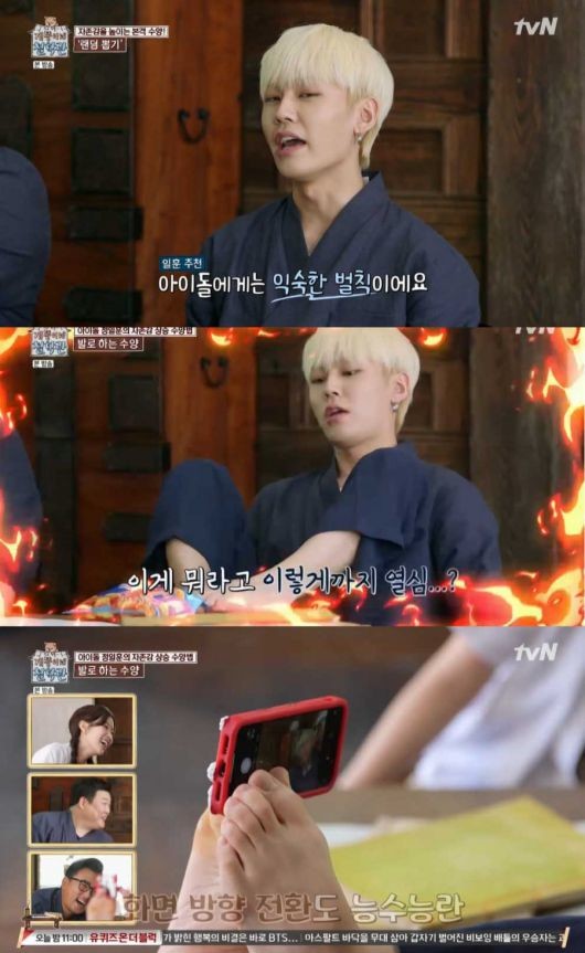 정일훈은 발로 무언가를 잘한다며 먼저 과자봉지 뜯기에 도전했다. 김준현은 정일훈의 발냄새를 맡더니 "내 손보다 낫다"고 말해 웃음을 불렀다. 이어 정일훈은 발로 휴대전화를 잡아 '셀카'를 찍으며 남다른 발재간을 드러냈다.