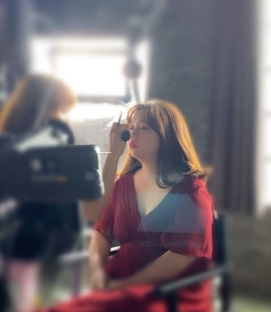 공개된 사진에는 붉은색 드레스를 입고 메이크업을 받고 있는 홍현희의 모습이 담겨있다.