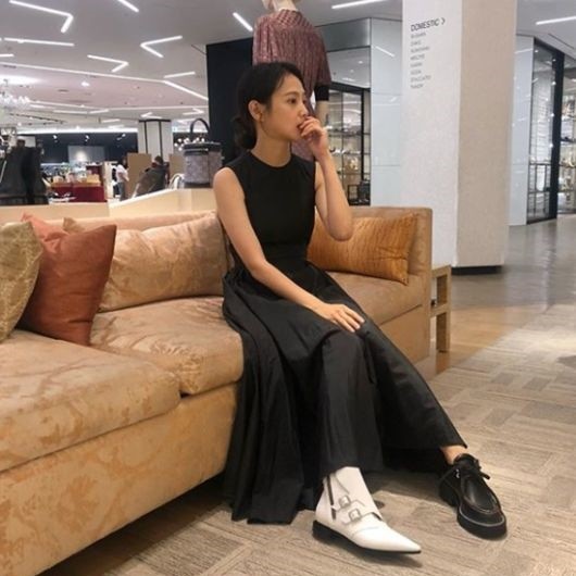 공개된 사진 속 윤승아는 소파에 앉아 색상이 다른 신발을 착용하고 있다. 윤승아는 흰색과 검정색 신발 사이에서 고민하고 있는 모습으로 눈길을 끈다.