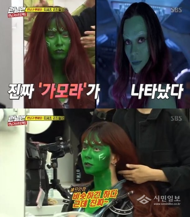 송지효도 거울을 보며 “진짜 비슷하긴 하다”고 자평했다. 유재석도 “가모라가 완벽하다. 가모라가 외계 미인인데 너무 완벽하다”고 감탄했다.