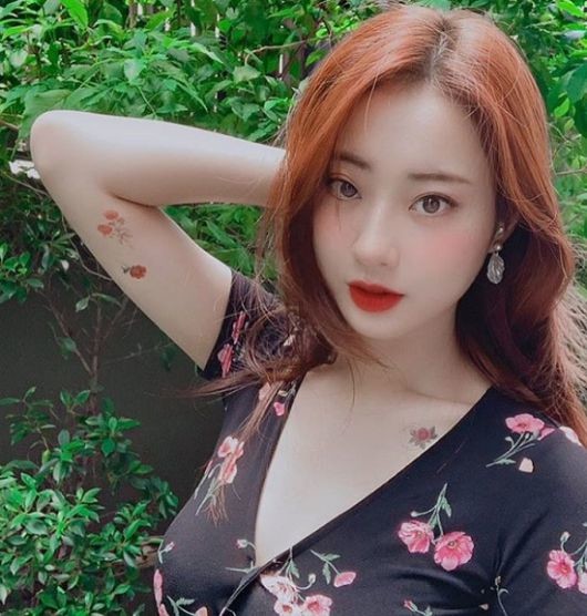 공개된 사진에는 화려한 패턴의 원피스에 장미 타투 스티커로 멋을 낸 경리의 모습이 담겨있다.