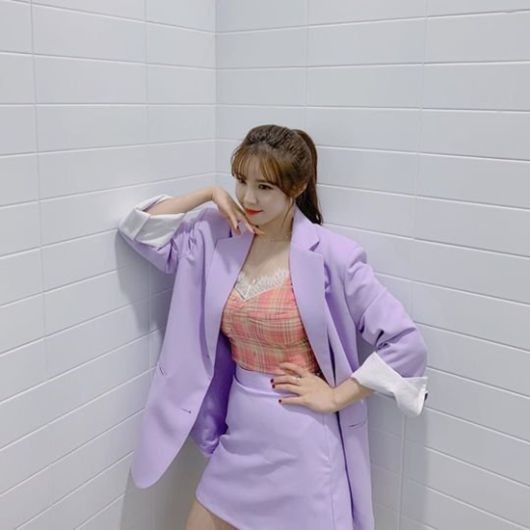 공개된 사진 속 전효성은 화사한 퍼플 재킷 패션을 선보이며 다양한 포즈를 취하고 있다.