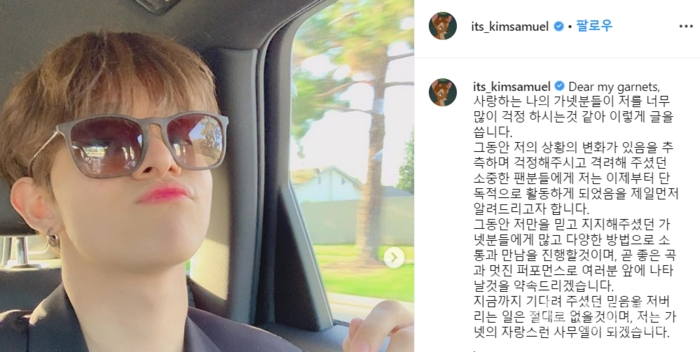 그러면서 “그동안 저만을 믿고 지지해주셨던 가넷 분들에게 많고 다양한 방법으로 소통과 만남을 진행할 것이며, 곧 좋은 곡과 멋진 퍼포먼스로 여러분 앞에 나타날 것을 약속드리겠다. 지금까지 기다려 주셨던 믿음을 저버리는 일은 절대로 없을 것이며, 저는 가넷의 자랑스러운 사무엘이 되겠다”고 덧붙였다.