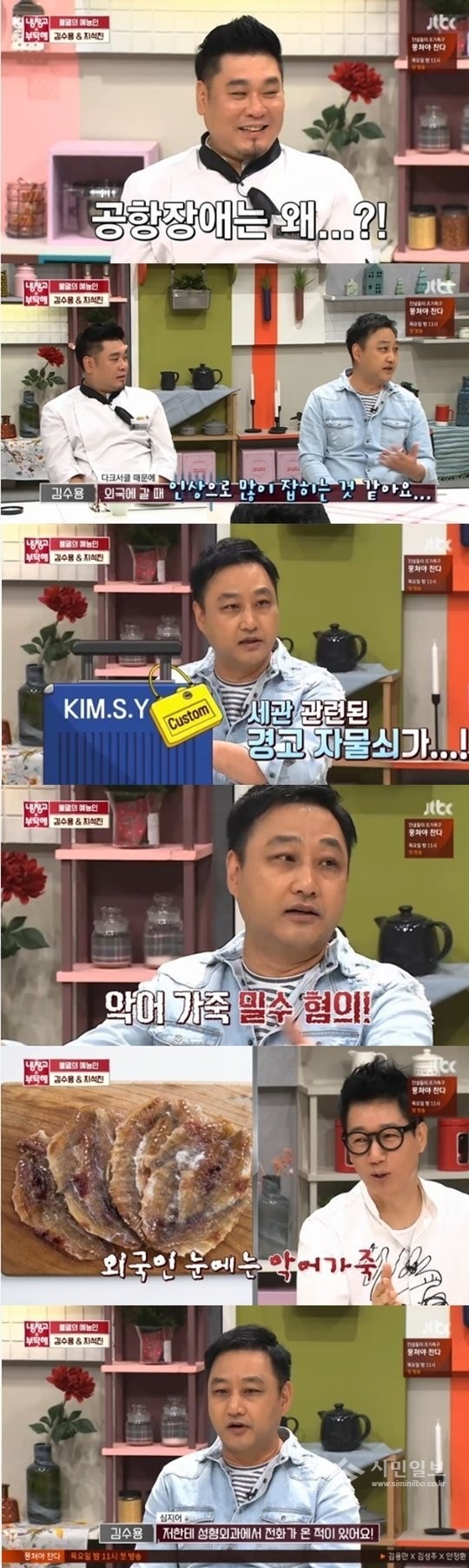 이날 MC 김성주가 “공황장애를 앓고 있냐”고 묻자 김수용은 “공황장애가 아닌 공항장애”라고 해명했다. 김수용은 “제가 다크서클 때문에 공항장애가 많다. 과거에도 외모 때문에 세관에서 많이 잡혔다. 마약 의심도 많이 받았다”고 밝혔다.