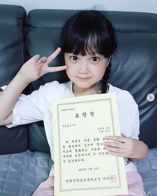 글과 함께 공개된 사진에는 김설 양이 학교에서 받은 표창장을 자랑하고 있다. 큰 눈망울과 귀여운 이목구비가 인형 같은 비주얼이다. 칭찬 일색인 김설 양의 생활통지표 역시 시선을 사로잡는다.