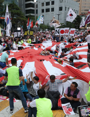 | ▲ 지난 20일 오후 서울 종로구 옛 일본대사관 앞에서 열린 일본의 경제보복과 아베 신조 일본 총리를 규탄하는 촛불집회가 끝난 뒤 참석자들이 대형 욱일기를 찢는 퍼포먼스를 하고 있다. /연합뉴스 | ||