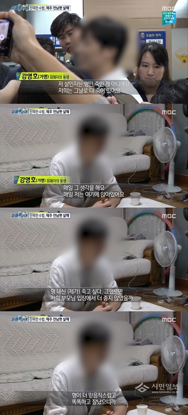 이날 방송에서는 피의자 고유정의 1차 진술을 듣고 충격에 쓰러진 피해자 남동생이 말문을 열었다. 그는 "살인자는 형만 죽인 게 아니다. 부모님도 죽인 거다"고 말했다.