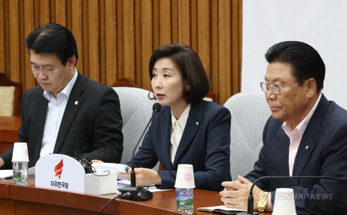 한국당 나경원 원내대표는 이날 국회에서 열린 원내대책회의에서 "이미 나온 해법도 모른 척하는 문재인 정권은 극일은커녕 대한민국을 영원히 일본에 뒤처지게 만들고 말 것"이라면서 "철없는 친일 프레임에나 집착하는 어린애 같은 정치는 멈추고 현실을 직시하기를 바란다"고 포문을 멸었다.