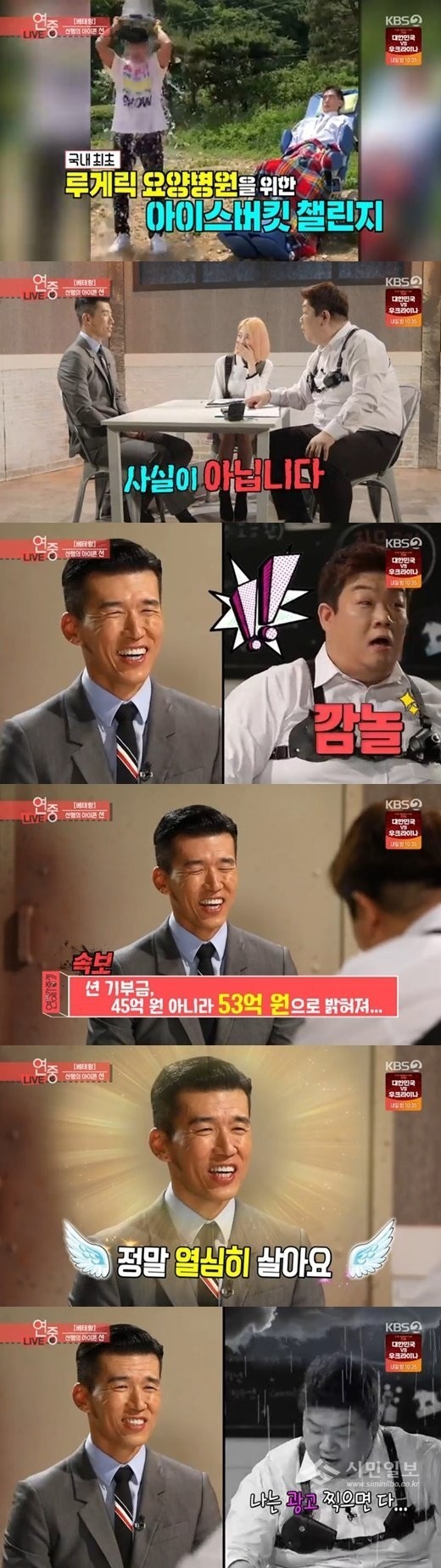 이어 유민상은 "지금까지 기부금만 45억원이라고?"라고 물었고, 션은 "아니다. 실제는 53억 정도 된다"라고 말해 모두를 놀라게 했다.