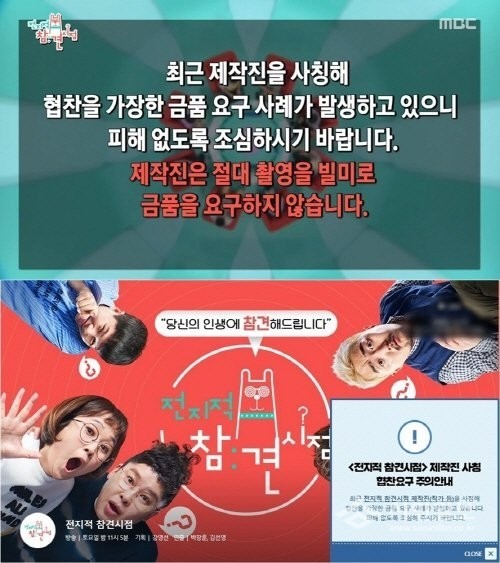 한편 '전지적 참견 시점' 측은 공식 홈페이지를 통해서도 "최근 제작진(작가 등)을 사칭해 협찬을 가장한 금품 요구 사례가 발생하고 있다. 피해 없도록 조심해 주시기 바란다"고 당부했다.
