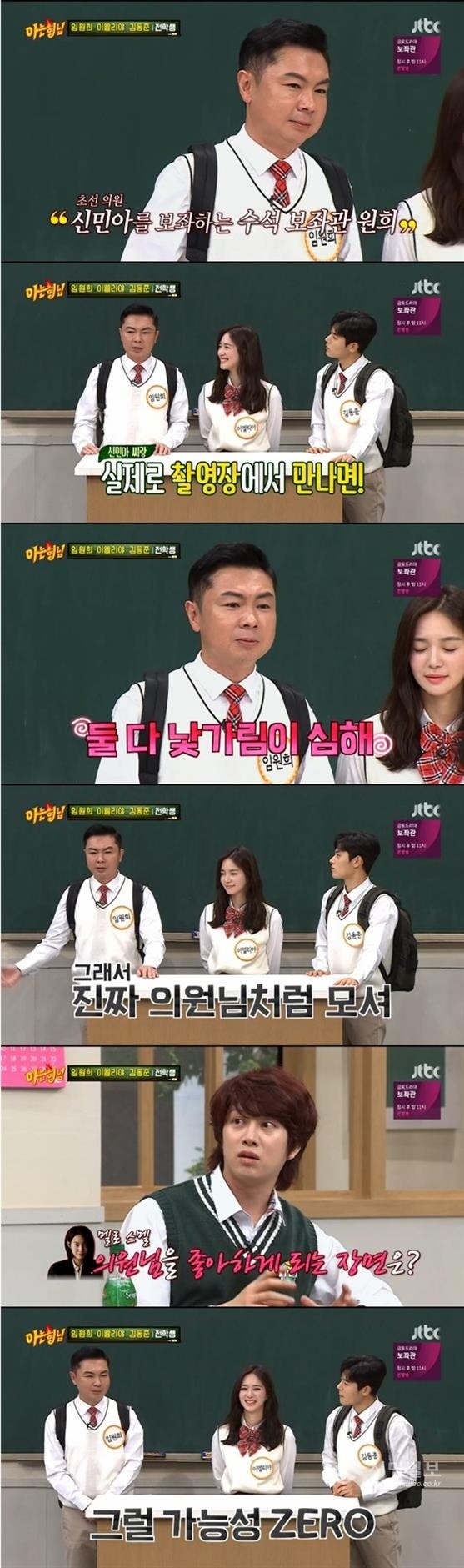 이를 들은 김희철은 "신민아씨를 좋아하고 그런 스토리는 없어?"라고 물었다. 그러자 임원희는 "그럴 가능성은 거의 없을거야"라고 단호하게 말해 웃음을 자아냈다.