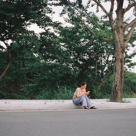 사진 속 이엘리야는 나시에 하늘색 슬랙스를 입고 검은 슬리퍼를 신은 채 가로수가 자란 도보 위에 앉아 핸드폰을 들여다고 보고 있다.