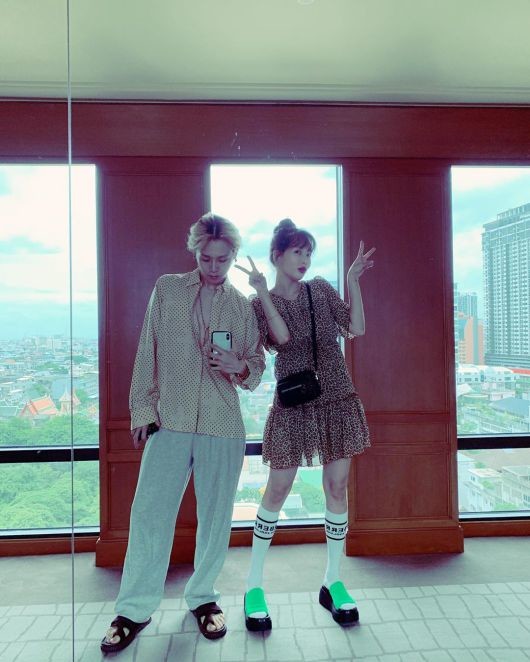 사진 속 이던은 거울에 비친 자신을 찍고 있는 모습이다. 이던의 옆에는 호피무늬 원피스를 입은 현아가 양손에 V를 하고, 이던에게 몸을 기울여 한쪽 어깨를 붙이고 있다.