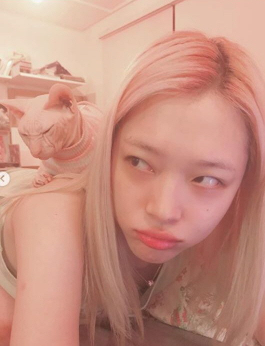 공개된 사진 속 설리의 등 위에는 반려묘가 앉아 있다. 반려묘를 힐끔 쳐다보는 설리의 뾰로통한 표정이 눈길을 끈다.