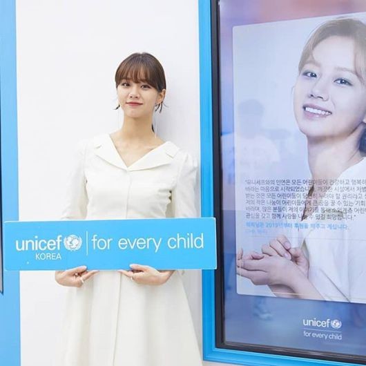 사진 속 혜리는 흰 원피스를 입은 채 유니세프 팻말을 들고 자신의 사진 옆에서 미소짓고 있다.
