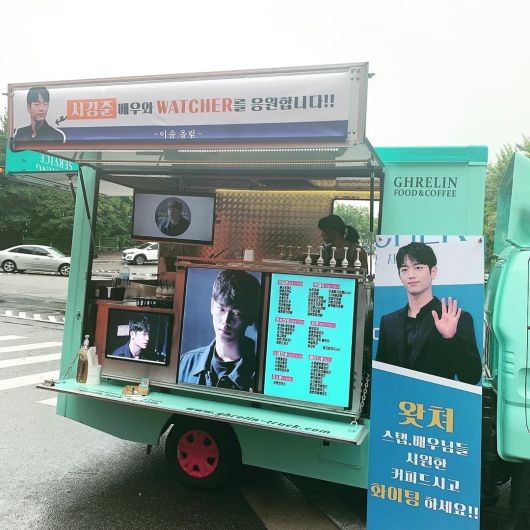 사진에는 이솜이 보내준 민트색 커피차가 있다. 커피차에는 '서강준 배우와 WATCHER를 응원합니다!! 이솜 올림'이라는 글이 적혀있다.