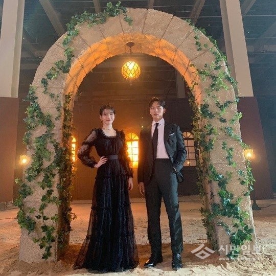 공개된 사진 속 아이유는 블랙 롱드레스를 입고 허리에 손을 올린 채 환한 미소를 짓고 있다. 여진구는 수트를 입고 굳은 표정으로 서있다. 롱드레스 패션에 돋보이는 우아한 미모가 시선을 사로잡는다.