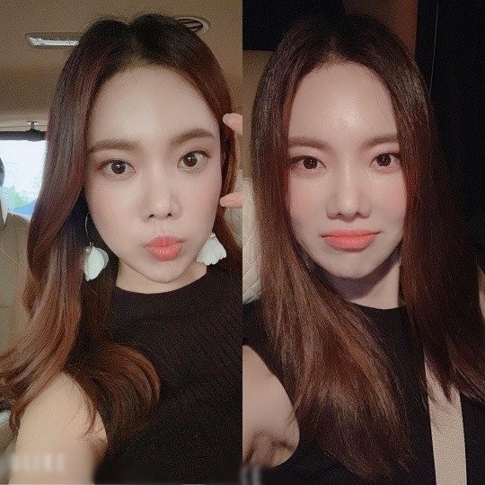 왼쪽에 위치한 사진 속 김나희는 웨이브 헤어스타일을 하고 귀여운 덕페이스 표정으로 상큼한 매력을 발산하고 있다. 비를 맞은 후 김나희는 청초한 매력이 물씬 느껴지는 비주얼로 눈길을 끌었다.