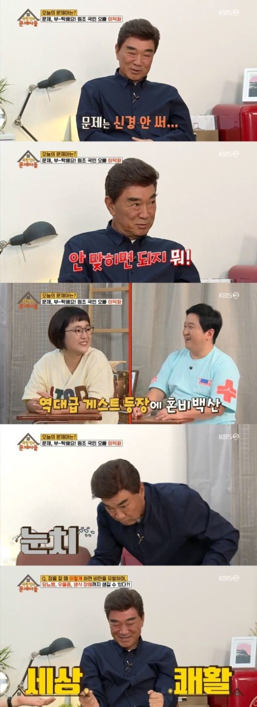 퀴즈 이야기를 들은 이덕화는 “여기 문제 많이 내니?”라고 물었고, MC들은 “여기 뭐 하는 줄 알고 나오신 거에요”라며 당황했다. 이에 이덕화는 이야기하러 나오는 줄 알았다면서 “문제 신경 안 써. 문제 안 맞히면 되지.”라고 말해 웃음을 자아냈다.