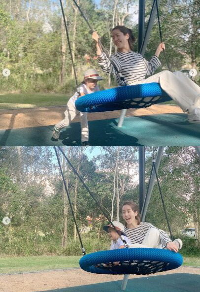 공개된 사진 속에서 한지민은 조카가 태워주는 그네에 앉아서 행복한 미소를 지었다.