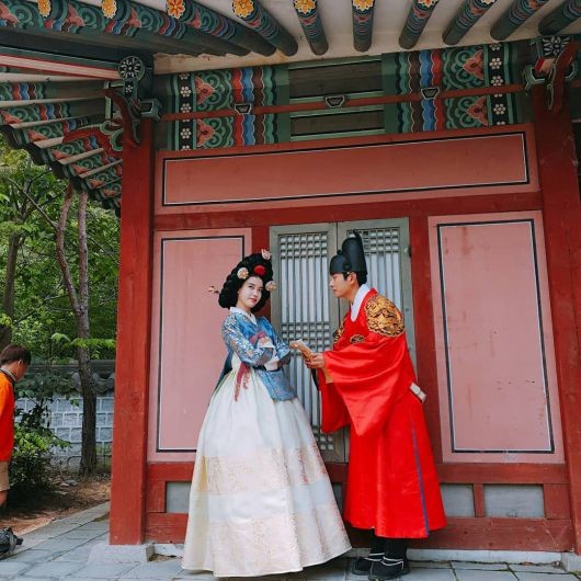 사진 속 이이경은 왕 복장으로 가채를 쓰고 화려한 한복을 입고 있는 이지은에게 대본을 들이밀고 있다. 또 다른 사진에서는 뒷짐을 지고 근엄한 왕 흉내를 내고 있다.