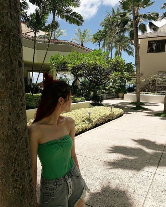 공개된 사진 속 이유비는 어깨가 드러나는 초록색 상의와 핫팬츠를 입은 채 포즈를 취하고 있는 모습.