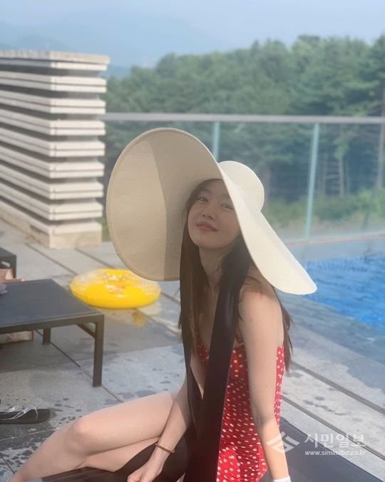 사진 속에는 물방울 무늬 새빨간 수영복과 거대한 챙모자를 착용한 한선화의 모습이 담겨 보는 이의 감탄을 자아냈다.
