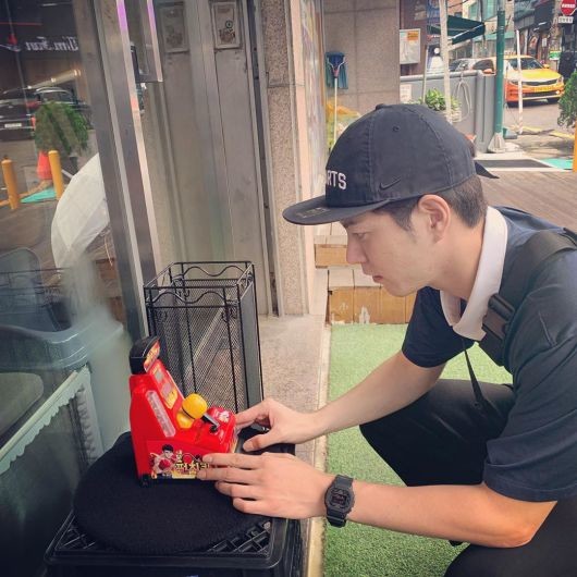 사진 속 홍종현은 한 상가 건물 앞에서 작은 손가락 펀치 기계를 앞에 두고 진지한 표정을 짓고 있다. 이어진 영상에서 그는 기계를 손가락으로 때린 후 받은 '883'점을 직접 보여준 후 '쌍따봉'을 해보였다.
