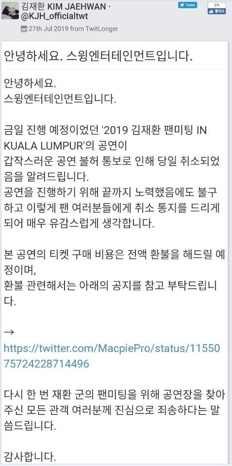 이에 김재환 측은 공식 SNS를 통해 "쿠알라룸푸르에서 진행될 예정이던 팬미팅이 갑작스러운 공연 불허 통보로 인해 7월27일 당일 취소되었음"을 알려 누리꾼들의 시선을 모았다.
