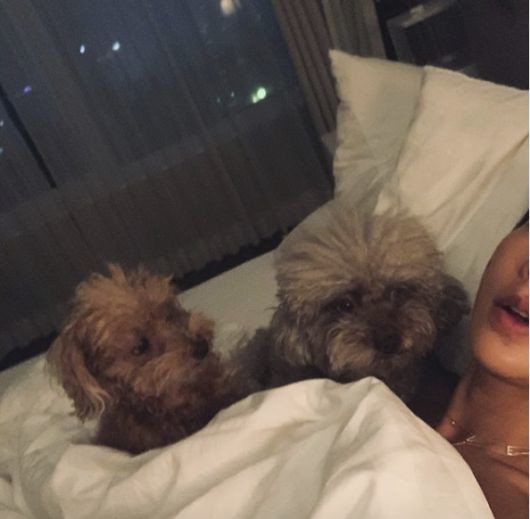 김준희는 31일 자신의 인스타그램에 “방금 우루르쾅 하고 천둥소리가 나자마자 각자 집에서 자고 있던 똥강아지 두마리가 무섭다고 쪼르르 엄마테 와서 저러고 있어요. 아 미치겟다 진짜 #너무귀여워 #확깨물어버리까”라는 메시지를 적었다.