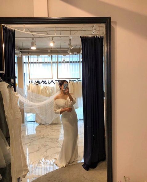사진 속에서 박지윤은 웨딩드레스를 입은 모습을 휴대폰으로 촬영하고 있는 모습이다.