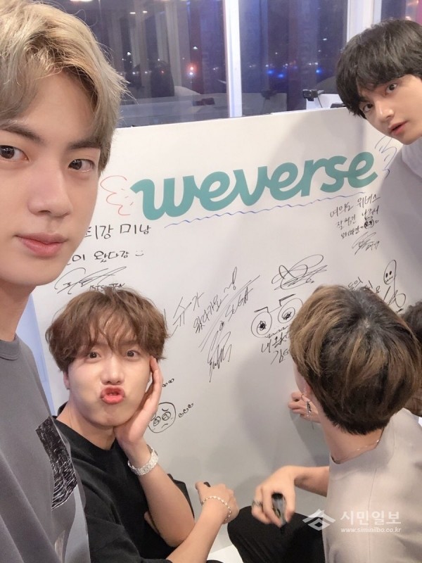 제이홉과 뷔, 지민, 진은 최근 방탄소년단 공식 트위터를 통해 ‘위버스(weverse)’라고 적힌 큰 팻말과 함께 찍은 사진을 게재했다.