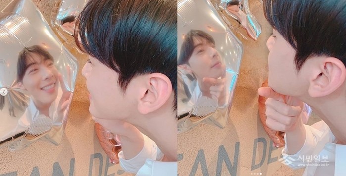 차은우는 최근 자신의 인스타그램을 통해 거울처럼 비춰보이는 풍선 앞에서 찍은 여러 장의 사진을 게재했다.