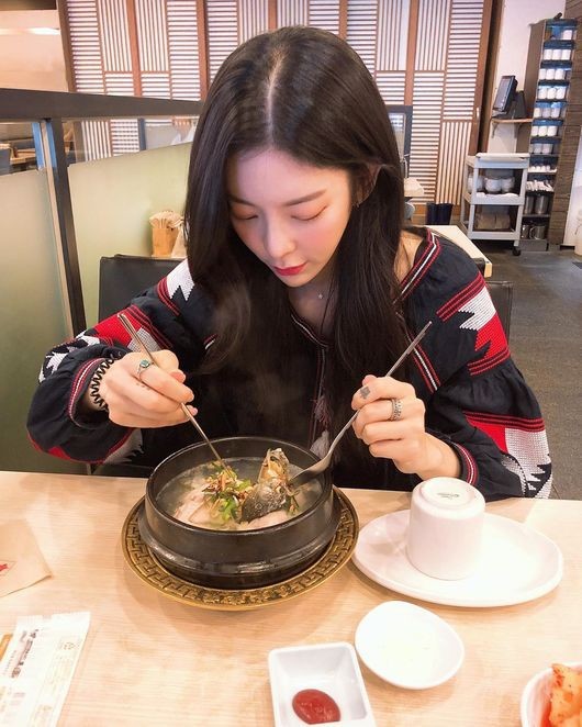 공개된 사진 속 장재인은 전복 삼계탕을 먹고 있다. 에스닉 블라우스를 착용한 장재인은 한눈에 봐도 가녀린 몸매로 보호본능을 자극한다.